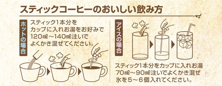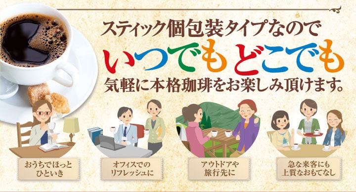 | こんな方にオススメです | 忙しい時でも本格コーヒーを楽しみたい方:忙しい朝や仕事中でも、さっとお湯を注ぐだけで本格的なコーヒーを味わうことができます。 急な来客時に上質なおもてなしをしたい方:スティックコーヒーならすぐに上質なコーヒーを提供できます。簡単に淹れられるのに、本格的な味わいが楽しめるため、お客さんにも満足してもらえる一杯を出すことができます。 |