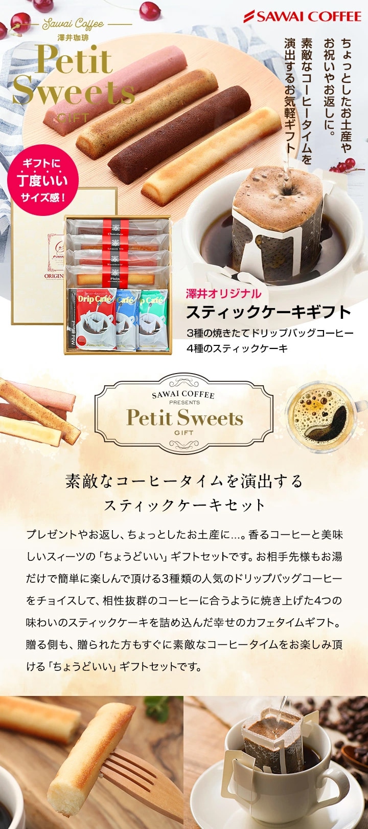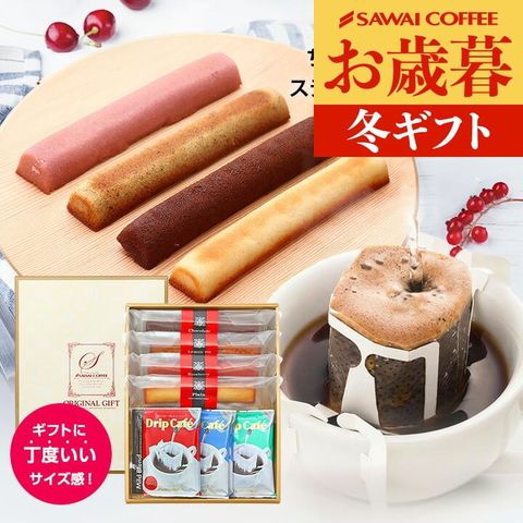 お歳暮 コーヒーギフト ドリップ コーヒー スイーツセット 送料無料【澤井珈琲 ドリップコーヒー3種&しっとりスティックケーキ4本 】 お菓子 ケーキ プレゼント 手土産 御歳暮 冬ギフト