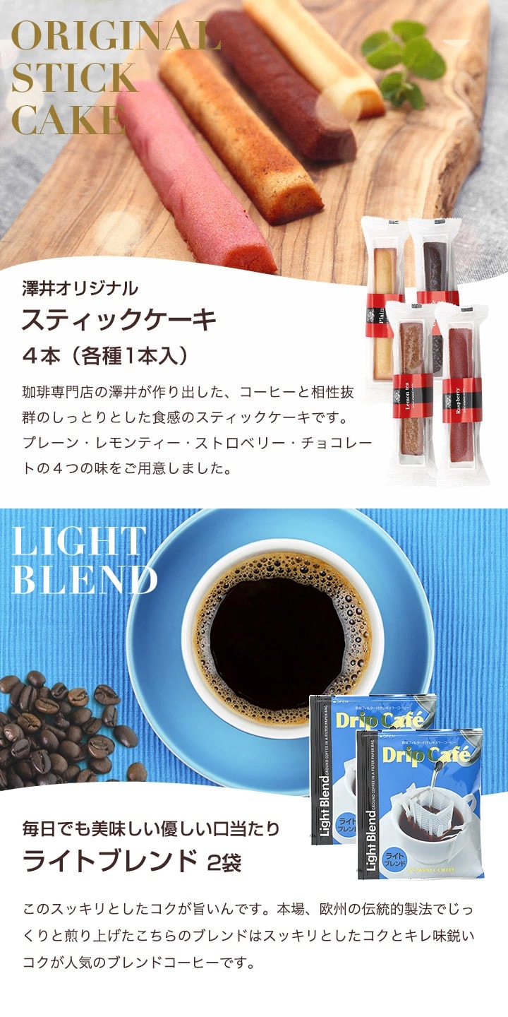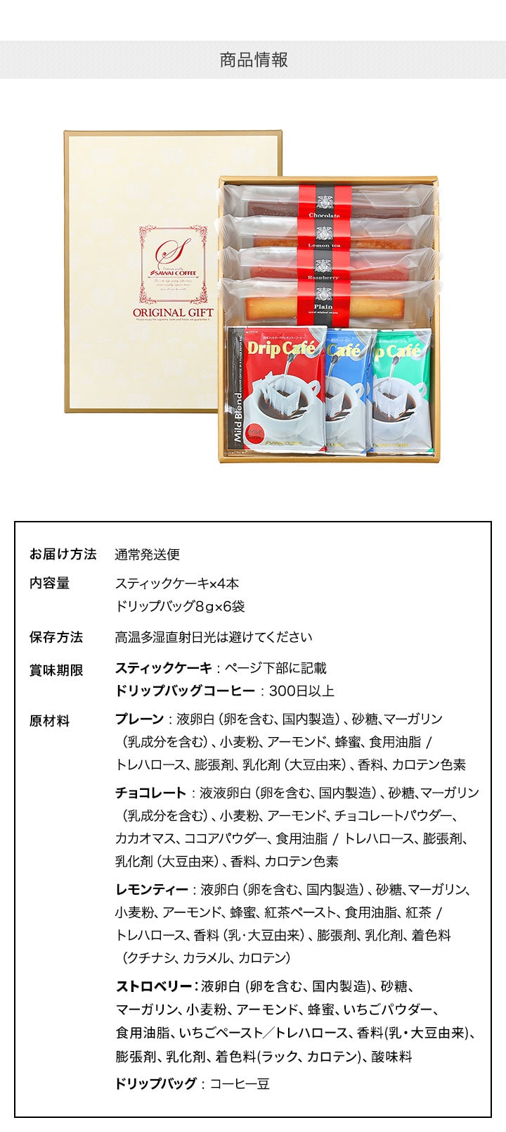 | 内容量 | スティックケーキ×4本 ドリップバッグ8g×6袋 |