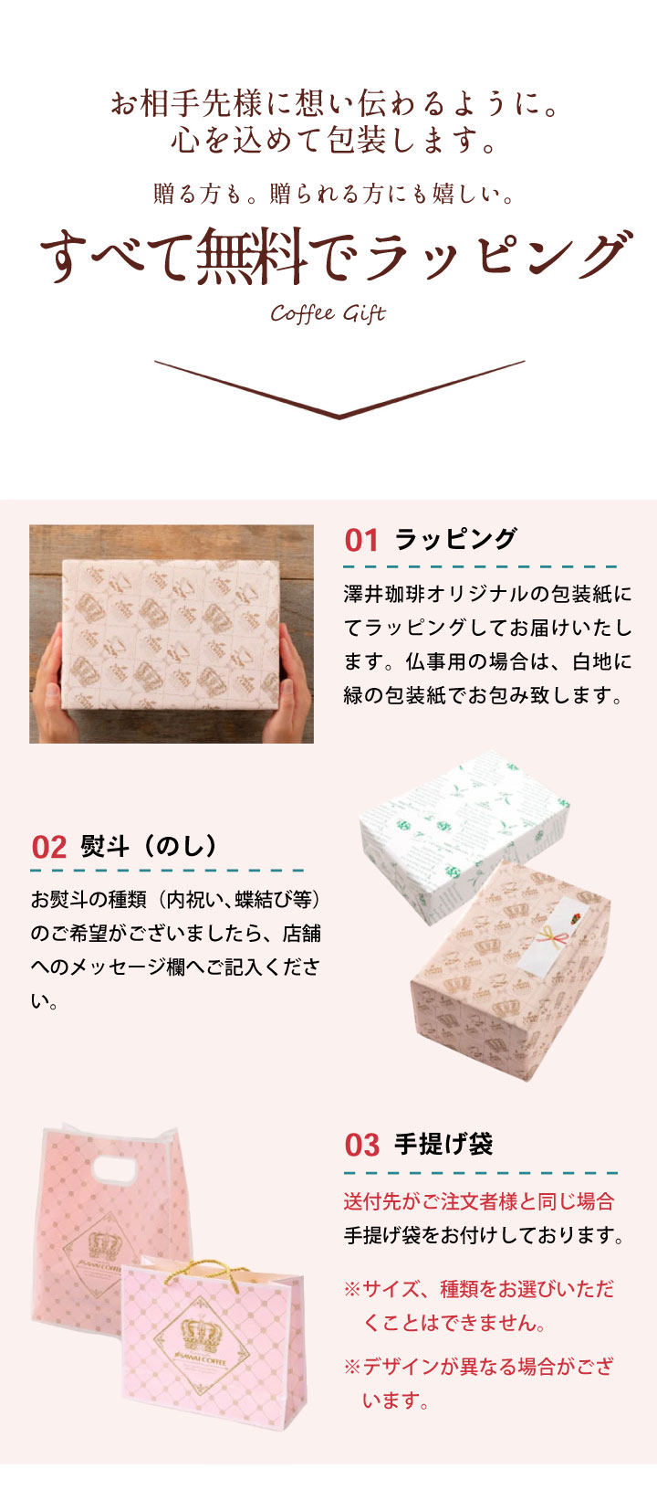 澤井珈琲(さわいこーひー)では、お客様のお家に商品が届き、箱を開けた瞬間。そして、トレードマークの赤いコーヒー袋の封を開けた時に鮮度抜群の「香り高さ」と、飲んだときの「味わい」に感動して頂けるように、レギュラーコーヒーはご注文を頂いてから焙煎をして焼きたてのコーヒー、コーヒー豆、珈琲、珈琲豆をお届けをしている焼き立て珈琲専門店です。お客様に「美味しい」と言って喜んで頂く事が私たちの喜びと思ってます。「美味しいコーヒーをお届けしたい」と想い続けて生まれたこだわりの味を、どうぞ、この機会にお楽しみくださいませ。澤井珈琲では、コーヒー豆は挽き方がご選択いただけます。珈琲豆を挽く事をお楽しみ頂ける『豆のまま』や、私共の専用の特注サイズの大型のミルで挽いて、コーヒー粉の状態にしてお届けする方法がございます。中挽き、細挽き、粗挽き、荒挽きなど様々な挽き方がございますが、私共がお薦めする『店長のおすすめ挽き』にて、そのコーヒーに合った一番美味しいと思える挽き方に挽いてお届けします。東京の銀座にも実店舗を構え、都内では浅草やスカイツリーのあるソラマチにも出店。「鳥取のコーヒー屋さん」とも呼ばれてますが、空気が綺麗で自然豊かな鳥取県に焙煎工場を構え、隣接する島根県の松江市や出雲市にも実店舗がございます。顔の見えないネット通販ですが、全国11店舗を展開する安心安全な澤井珈琲は、特徴的な「赤いコーヒー袋」に入れて、全国の珈琲好きにお選び頂いてます。よく間違えられる名前として、沢井珈琲、沢井コーヒー、澤井珈琲店、澤井珈琲本店、さわいこーひー、サワイコーヒーなどがございますが、正式名称は澤井珈琲となります。