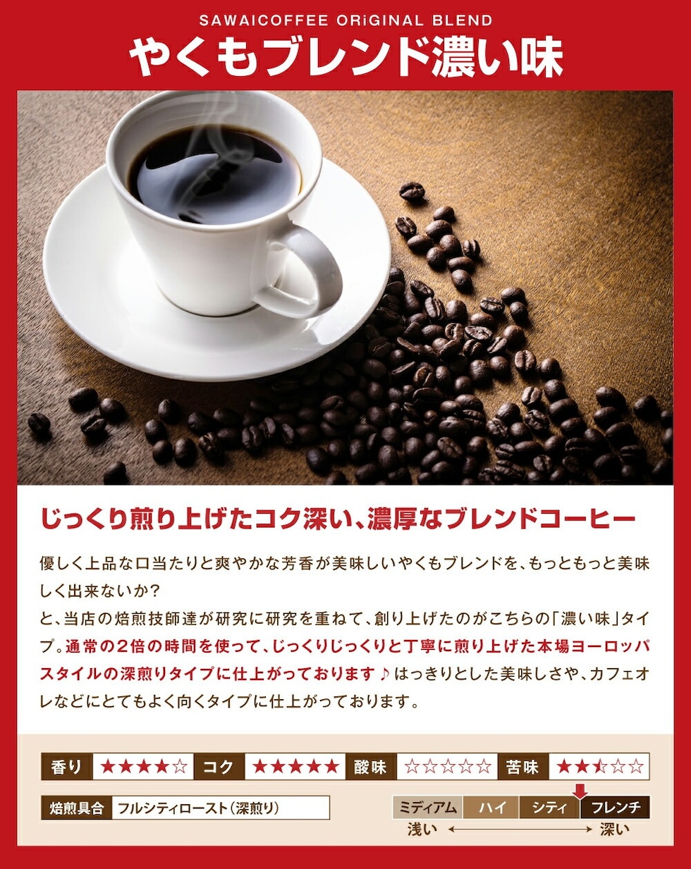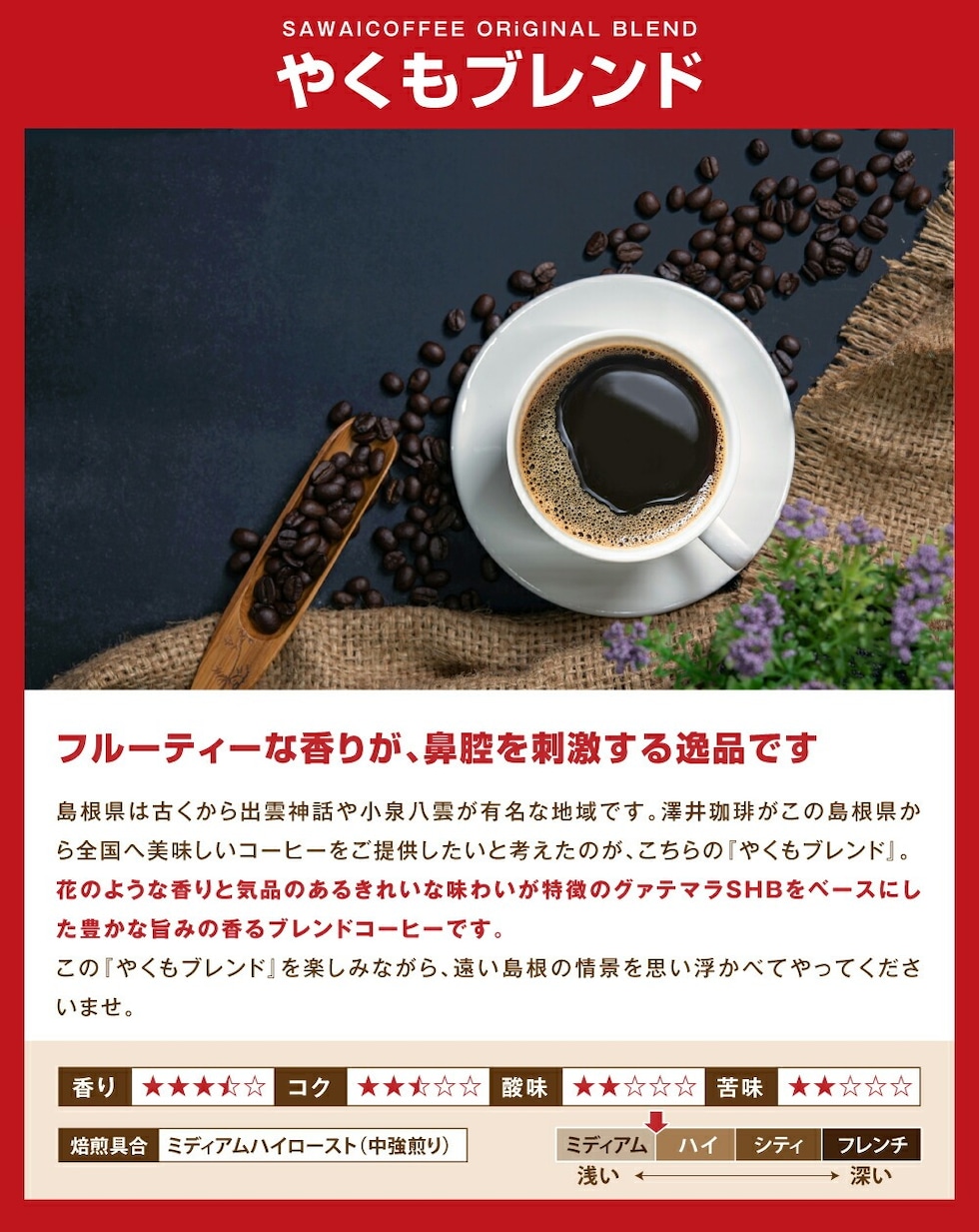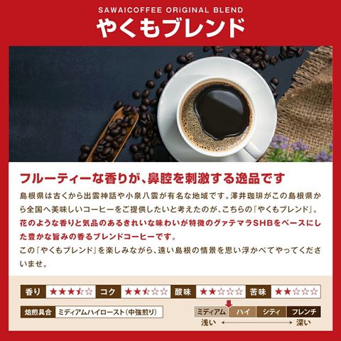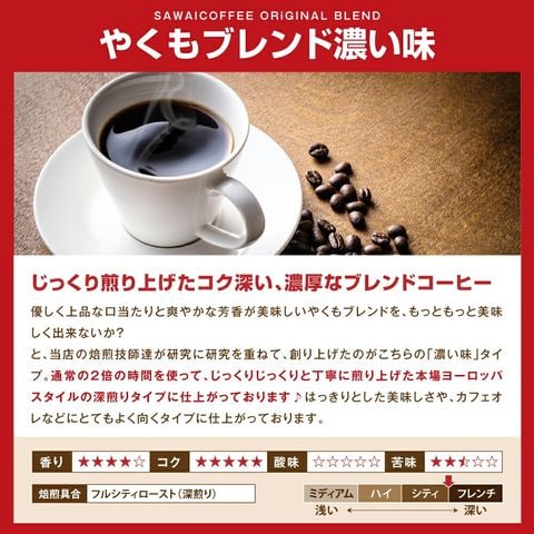 | 内容量 | ●レギュラコーヒー 【500g×4袋(約200杯分)】 ・やくもブレンド 500g×2袋 ・やくもブレンド濃い味 500g×2袋 |