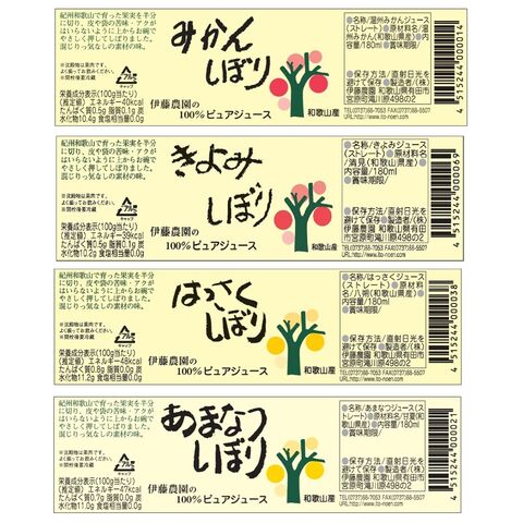 | 商品内容 | 100%ピュアジュース みかん180ml×2本 100%ピュアジュース きよみ180ml×2本 100%ピュアジュース はっさく180ml×2本 100%ピュアジュース あまなつ180ml×2本 計8本 |