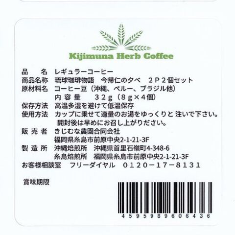 | 商品内容 | きじむなファーム 琉球珈琲物語 今帰仁の夕べ 2包入スタンドバッグ 2個セット |