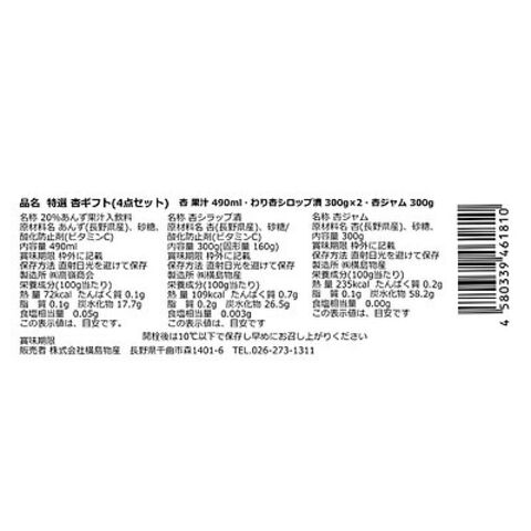 | 商品内容 | 杏果汁 490ml×1本入 杏ジャム 300g×1本入 わり杏シロップ漬300g×2本入 |