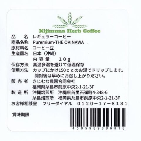 | 商品内容 | きじむなファーム 100% 沖縄産コーヒーPremium The OKINAWAドリップバッグ個包装 10g |