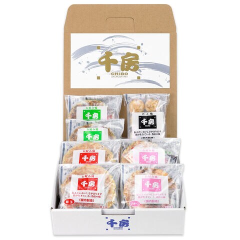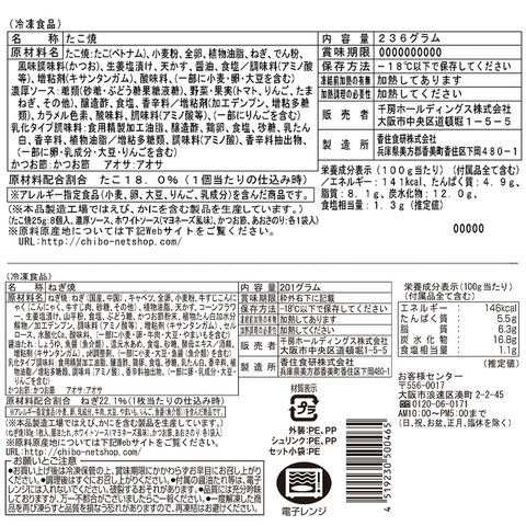 豚玉・もちチーズ各200g×2個 / ねぎ焼すじこん180g×2個 / たこ焼8個入、千房ソース25g×5個 / 醤油たれ10g×2個 / ホワイトソース10g×7個 / かつお節1g×7個 / あおさのり0.2g×7個