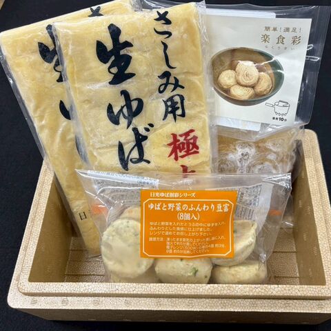 | 商品内容 | ・極上おさしみ用ゆば ×1 ・おさしみ用ゆば ×1 ・だしが決め手のゆば煮付け ×1 ・ゆばと野菜のふんわり豆腐8個入り ×1 |