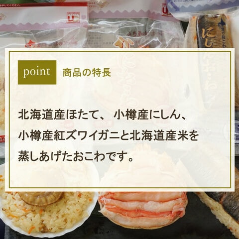 | 商品内容 | 紅ずわい蟹おこわ:2パック/ほたておこわ:2パック/にしんおこわ:2パック |