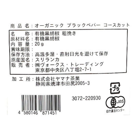 ヴォークススパイス 有機 ブラックペパーコースカット(袋) 20g×6個