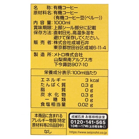 | セット内容 | ● 成城石井 成城石井 ペルー産最高等級アラビカ豆 オーガニックアイスコーヒー無糖 1000ml:12本 ● 成城石井 ショッピングバッグ ネイビーオレンジ ※ショッピングバッグは同封にてお届けいたします |