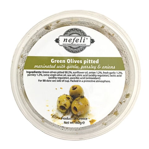 【送料込み】ギリシャ ネフェリ グリーンオリーブ オニオン・パセリ 160g×3個