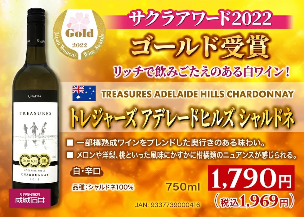 オーストラリア トレジャーズ アデレードヒルズ シャルドネ 750ml | サクラアワード2022 ゴールド受賞