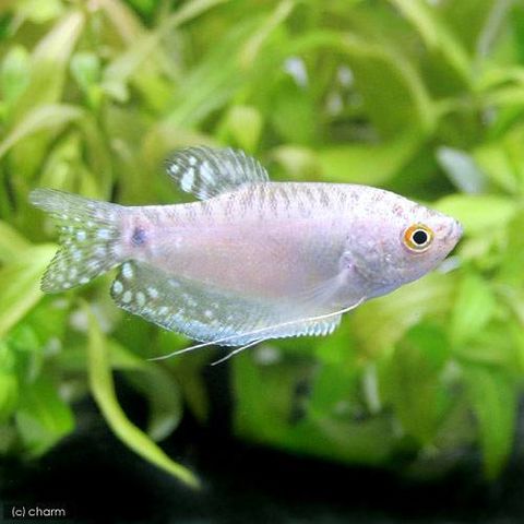 | 種類詳細 | 東南アジアに広く生息するスリースポット・グラミーの改良品種です。 古くからポピュラーな種で、原種が持つ青い色彩はほとんど無く、各ヒレに散りばめられたパールスポットが本種の特徴です。 飼育は容易で、同種間で小競り合いをしますが、温和でゆったりとしていることから、小型魚との混泳も可能です。 繁殖はオスが泡巣を作るタイプで、水槽内でも容易に産卵に至ります。 しかし稚魚が小さいことから初期試料が難しく、インフゾリアなどを用意する必要があります。 |