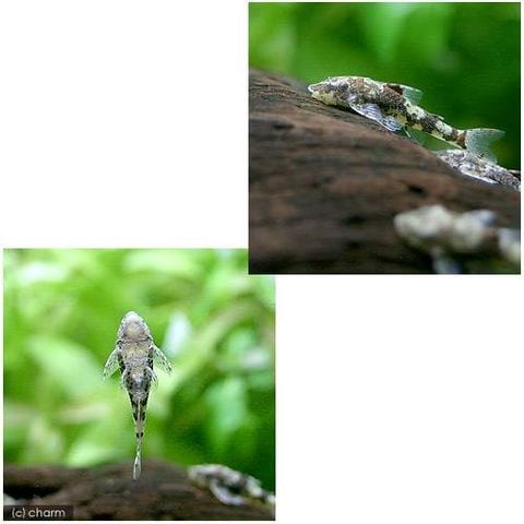 | 飼育のポイント | 茶ゴケを主食とするため、水槽内での長期飼育では人工飼料にいかに餌付けるかが重要です。プレコやコリドラス用のタブレットだけでなく、底砂に落ちたフレークフードも食べますが、エサと認識するようになるにはやや時間がかかります。茹でたほうれん草や、きゅうりを吸い付きやすいように水槽内に立てたり、赤虫やブラインを食べさせる方法も知られますが、他の混泳魚に食べられないようにして、水質の悪化に注意が必要です。ソイルや流木を齧らせることで、餌付くまでの期間を乗り越えやすくなります。水質や水温の変化にデリケートな部分を見せるので水槽導入時は特に注意が必要です。 |