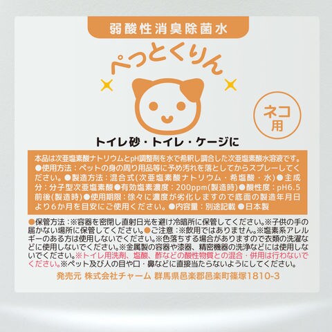 | ご注意 | ※飲用ではありません。 ※塩素系アレルギーのある方は使用しないでください。 ※色落ちする場合がありますので衣類の洗濯などに使用しないでください。 ※金属製の容器や漆器、精密機器の洗浄などには使用しないでください。 ※トイレ用洗剤、塩酸、酢などの酸性物質との混合・併用は行わないでください。 ※ペット及び人の目や口・鼻などに直接当たらないようにしてください。 ※食品類に直接ご使用された場合には、ご使用後必ず水道水で洗い流してください。 ※本品はティッシュペーパーなどに散布しても、溶けたり変色したりすることなくご使用できます。 |