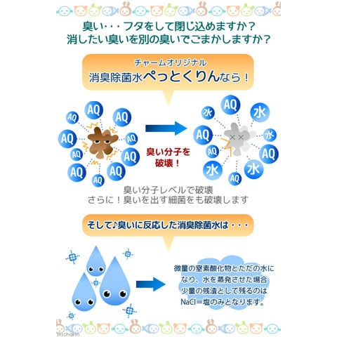 | 特長 | ●愛猫の身の回りの用品に効果的な消臭&除菌スプレーと濡らしても丈夫で破れにくい不織布「ワイプオール」のセットです。 ●ワイプオールは濡らしても丈夫で破れにくいので、ぺっとくりんを噴射して拭き取る際に最適です。 ●ぺっとくりんについて ・本品は食品添加物として厚生労働省に認められている次亜塩素酸ナトリウムをpH調整剤と水で調合した消臭・除菌水です。 ・化学的に臭い分子を破壊することで消臭効果を発揮します。 ・有効塩素濃度200ppm、pH6.5前後の弱酸性で万一口に入っても安全です。 ・愛猫の身の回りの消臭&除菌にご使用ください。 |