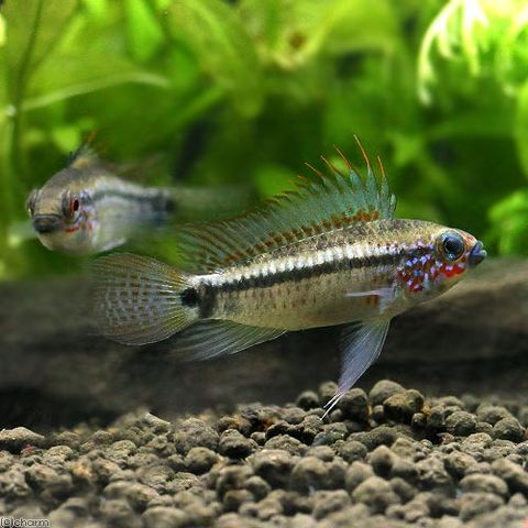 | 種類詳細 | ペルー、イタヤ川原産のアピストグラマです。 2004年にアピストグラマ・エレムノピゲ(Apistogramma eremnopyge)として記載されました。 ディアマンテはスペイン語でダイヤモンドを意味するように、美しい体色を持つ種です。 体側には1本のラインが見られ、背ビレの棘状が伸長しライヤーテールの尾ビレを持ちます。 口、尾筒、背ビレ前方は黒く染まり、頬の赤い模様が本種の特徴といえます。 飼育は容易で、水質にもうるさくなく中性付近でも飼育できます。 繁殖も容易で、pHを下げたりしなくても成功にいたるようです。 |