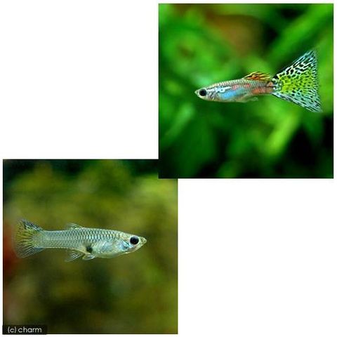 | 繁殖 | グッピーは非常に繁殖力が強く、卵ではなく稚魚を生む卵胎生です。オスは尾ビレが細長くなった交接器(ゴノポディウム)を持ち、メスは交尾後1ヶ月程で仔魚を生みます。 メスのお腹が膨らみ、尾ビレ付近の黒い部分が目立ってきたら出産が近いです。初産では産仔数は少なく、大きなメスは100匹近く仔魚を産み、1度の交尾で数回仔魚を産むことができます。 メスがせわしく泳いだり、水槽の下でボーッとする行動が見られたら、稚魚が他魚や親魚に食べられないように産卵ケースや別水槽に移動してください。 グッピーの稚魚はすぐに細かな人工飼料を食べられます。餌の与えすぎによる水槽の悪化に注意して、少量の餌を1日に数度与えます。1ヶ月程度でオスメスが判別でき、3ヶ月程で交配可能です。 |