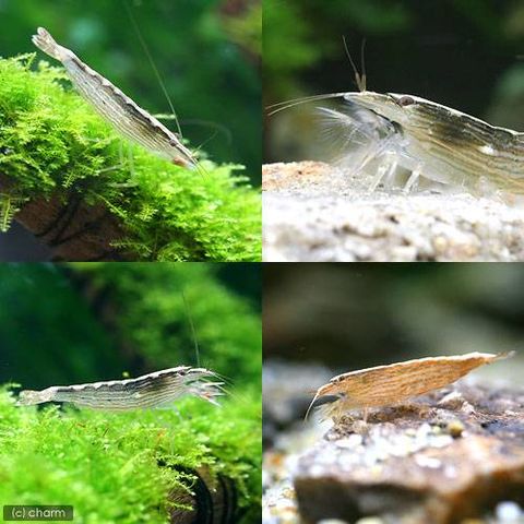 | 種類詳細 | 東南アジア原産のエビです。摂餌行動の面白い種で、第1、第2胸脚は細かい毛が密生し、これをアンテナのように広げて水中の微生物などを摂食しています。背中に太いラインと、体側には細かいライン模様を有し、成長と共に褐色になります。色彩には変異が大きく、黄色や赤褐色の個体が見られます。オニヌマエビを含むいくつかの種が含まれているようです。飼育は水質の悪化と高水温に注意が必要ですが、性質は温和で他の魚や、エビとの混泳も問題ありません。餌は特別なものを用意する必要はなく、熱帯魚用の餌などを細かくして与えてあげれば水槽内でも水流のあるところに集まって摂食行動している様子を見ることができます。 |