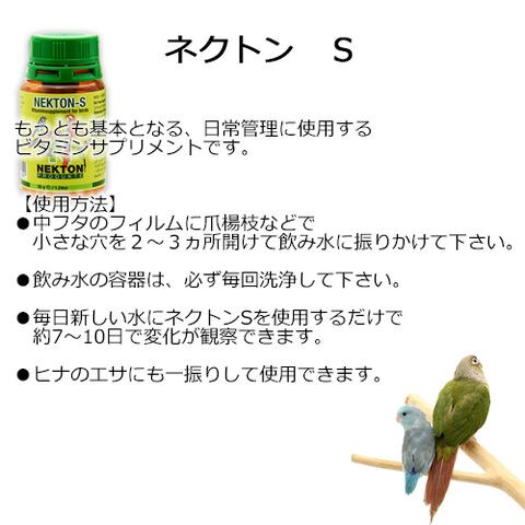 【パピエ ネクトン S】 ●内ブタのホイル面に爪楊枝等で穴を開け、食塩のように手軽にお使いいただくこともできます。 ●少量を継続的に長期間与えるとより効果的です。 【ネクトン BIO】 ●250ccの飲水に対して付属のスプーンすり切り1杯(1g相当)を混ぜて与えます。 ●内ブタのホイル綿に爪楊枝等で穴を開け、食塩のように手軽にお使い頂くこともできます。 ●成長期、並びに換羽期が終わりましたら、「ネクトンS(別売り)」をご利用ください。なお、繁殖期にはネクトンBIOを与えないようにご注意ください。 |