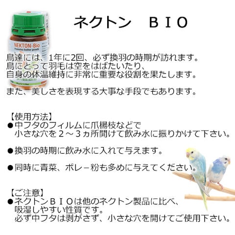 【パピエ ネクトン S】 ●ネクトン・Sは鳥類にとって必要不可欠な、13種類のビタミン、18種類のアミノ酸、各種微量元素がバランスよく配合されています。 ●水に素早く溶ける粉末タイプです。 ●全ての鳥類の病気に対する抵抗力の向上、繁殖の成功、美しい毛羽の維持、発育促進と骨格の向上のための補助食品です。 【ネクトン BIO】 ●ネクトンBIOは成長期や換羽期における鳥類の正常な羽毛発育促進のために特別に調整された鳥類用水溶性粉末栄養補助食品です。 ●ネクトンBIOには13種類のビタミン、17種類のアミノ酸、6種類の微量元素が鳥類の正常な羽毛発育促進のために最適な形で調合されています。 |