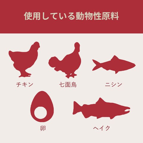 | 保証成分 | タンパク質:35.0%以上、脂質:22.0%以上、粗灰分:8.0%以下、粗繊維:5.0%以下、水分:12.0%以下、カルシウム:1.7%以上、リン:1.1%以上、オメガ6:2.7%以上、オメガ3:0.8%以上、DHA:0.15%以上、EPA:0.15%以上 |