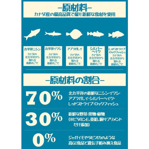 | 特長 | ●たんぱく源として魚のみを使用。必須脂肪酸である海産オメガ3(DHA・EPA)が豊富で、皮膚・被毛の健康が気になる犬におすすめです。 ●ノースバンクーバー島で水揚げした天然ニシン、イワシ、カレイ、シルバーヘイク、メバルなど、カナダ最高品質の原材料を使用しています。 ●穀物ゼロで犬の自然な食事を再現し、さらにBHA、BHT等の人工的な防酸化剤は不使用です。 |