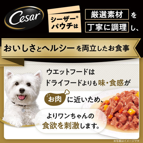 | 特長 | ●低脂肪なささみをふっくら蒸して低カロリーに仕上げました。(シーザーパウチ成犬 ビーフ&彩り野菜入り比29%減) ●丁寧な調理で素材のおいしさをそのまま閉じ込めました。 |