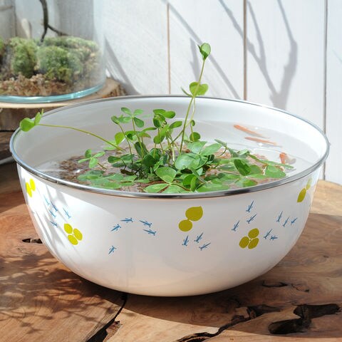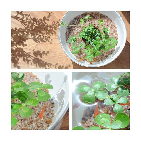 | 特長 | ●可愛らしい斑入りの四つ葉が大人気のウォータークローバー・ムチカとメダカで始めるミニビオトープセットです。 ●ムチカは四つ葉のクローバー(シロツメクサ)に似た草姿が特長の水辺植物です。 ●ホーローのボールはオリジナルデザイン、φ24cm×10cmで室内で楽しめるサイズです。 ●ムチカは肥料入りの専用ソイルに植え込まれている為、数ヶ月は肥料を与える必要がなく管理がとてもカンタンです。 ●冬期は葉が枯れ休眠します。気温が上がり成長期になるまでは水を切らさないように管理してください。(枯れた葉は取り除きます。) |