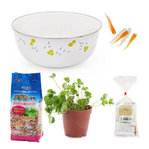 | セット方法 | (1)砂利を流水でよく洗ってください。 (2)ホーロー鉢を洗浄してください。 (3)バケツなどの容器に水をはり、Q10スタート(カルキ抜き)を入れてカルキを抜いてください。 (4)メダカの入った袋ごとカルキを抜いているバケツに入れ、水合わせをしてください。 (5)ムチカをボールの中央に配置してください。 (6)ムチカの鉢の周りに砂利を入れてください。 (7)バケツの水をボールに注ぎ、メダカを入れてください。 |