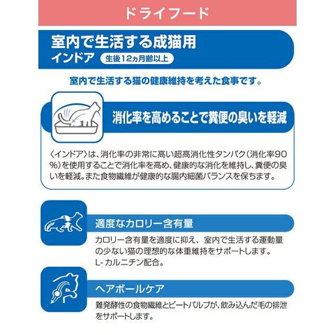 運動量の少ない室内で生活する猫の体重維持をサポートし、消化率を高めることで糞便の量と匂いを軽減