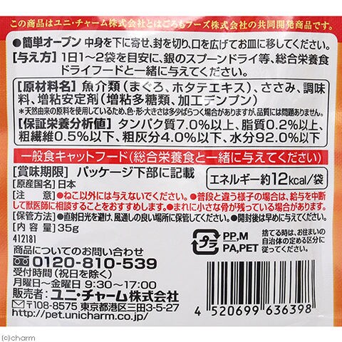 | 原材料 | 魚介類(まぐろ、ホタテエキス)、ささみ、調味料、増粘安定剤(増粘多糖類、加工デンプン) |