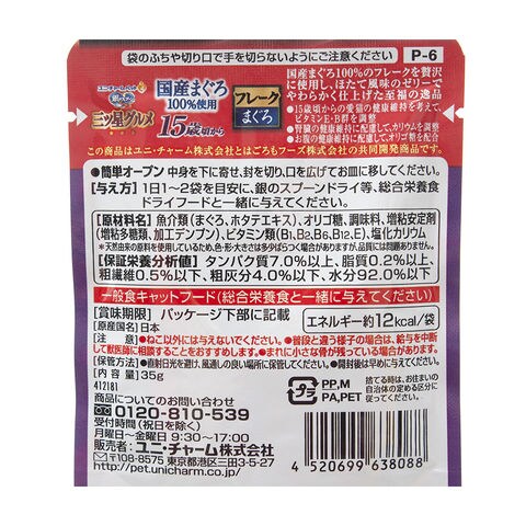 原材料 魚介類(まぐろ、ホタテエキス)、オリゴ糖、調味料、増粘安定剤(増粘多糖類、加工デンプン)、ビタミン類(B1、B2、B6、B12、E)、塩化カリウム