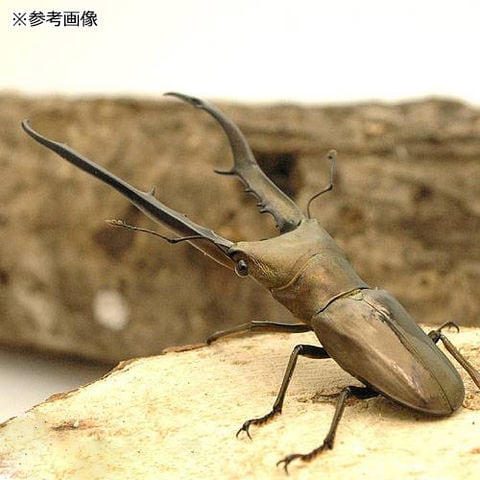 | どんな種類? | 全身が金属光沢を持つ美しいクワガタです。 金属光沢を持つ体色と非常に発達した大アゴは、美しく、格好の良いことから人気の種です。 大型個体は大アゴの長さが体長を超える程になります。 昼行性で観賞価値が高いだけでなく、生息地によって大アゴや色彩にバリエーションが見られコレクション性も高い種です。 メスが非常に小さな種ですが、オスの性格は温和でオスがメスを守るメイトガードと呼ばれる行動を容易に観察できます。 生息場所によって6亜種に分類され、代表的なのはスラウェシ島原産の基亜種、ペレン島産の亜種です。 特にペレン島産の個体は色彩変異が多く、青い個体も見られ人気を博します。 他の産地はあまり流通が多くありませんがハルマヘラ島のものは金属光沢が強く、タリアブ島のものは直線的な大アゴを持ち、サンギール諸島は上翅の肩口が角ばるなどの特徴が見られます。 バランスの悪い体型なので転倒防止の木端は絶対に必要です。 また長い大アゴは餌を食べづらいので、ゼリーを2つに切ったり、餌皿にカップから出す必要があります。 長い大アゴは挟む力が弱いのでペアでの同居は問題ありません。低温には弱いので20℃を切らないように注意が必要です。 |