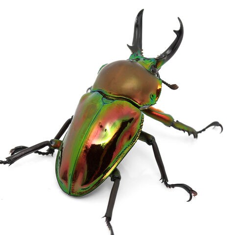 | どんな種類? | 世界で最も美しい色彩を持つクワガタです。 パプアキンイロクワガタと近い種で、小さな頭部、上方へ湾曲する大アゴ、独特の体型を持ちます。 メスは上翅に刻点を持ち、タマムシのようなニジイロに輝く体色は緑系、赤系、ブラックなどのバリエーションが見られます。 美しい体色を持ち、寿命が長く、飼育・ブリードが容易で初心者から楽しめることで人気の種です。 幼虫、成虫ともに強健な種です。産卵数が多く羽化不全が少ない点から非常にブリードが容易で、 流通している個体もブリード個体が多いです。本種は生物の持ち出しを禁止しているオーストラリア原産のため、 今後ワイルド個体が流通することは望めないでしょう。 オスのアゴの力が弱いので、同じケースでの多頭飼育が可能です。 30℃を超えるような高温を避ければ温度、環境に適応する能力も高いです。 |
