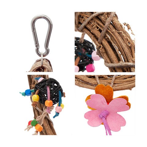 ●小鳥が大好きなカラフルなパーツのついたブランコにもなるおもちゃです。 ●小型~中型インコなどのサイズの鳥がリース部に載れ、ゆらゆらゆらしたりおもちゃを引っ張って遊べます。 ※木製ビーズ、革、革ヒモ、ラタンボールは色おまかせになります。 |