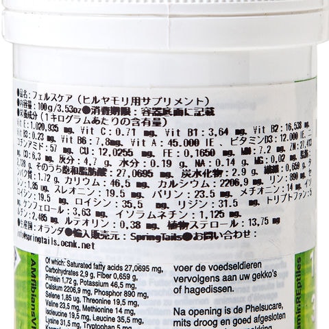 | ご注意 | ※本品は爬虫類用のサプリメントです。目的以外の用途では使用しないでください。 ※開封後は乾燥状態を保ち、元のパッケージに適切に密封されていれば、保存期間は6か月です。 |