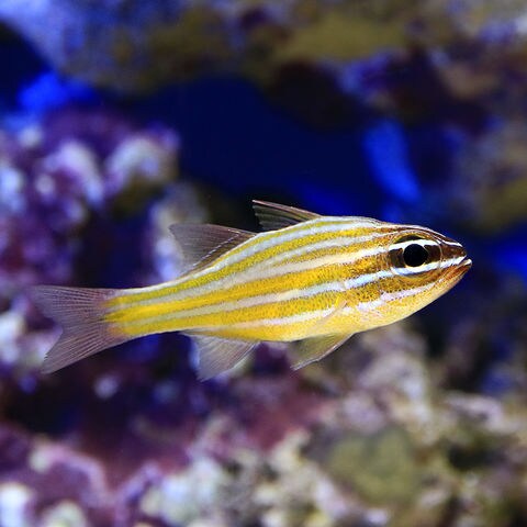 | 種類詳細 | 金色がかるタテジマが特徴的な美しいテンジクダイの一種です。 自然下では岩陰などに好んで生息しており、幼魚はガンガゼの間で身を守ることでも知られています。 |