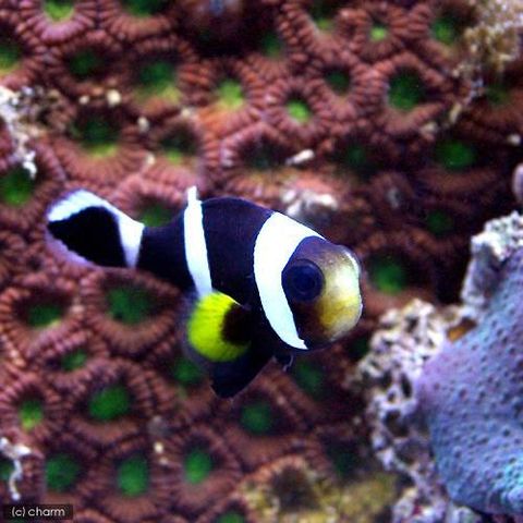 | 種類詳細 | トウアカクマノミに近い種類のクマノミで黒みがかった体に白いバンドが特徴です。 自然下ではイボハタゴイソギンチャクと共生していますが、シライト等にも入ることがあります。 雄性先熟型の性転換を行うので小さい個体がオス、大きくなった個体がメスになる性質を持っています。 |