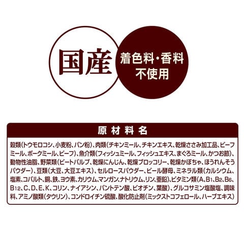 | 原材料 | 穀類(トウモロコシ、小麦粉、パン粉)、肉類(チキンミール、チキンエキス、乾燥ささみ加工品、ビーフミール、ポークミール、ビーフ)、 魚介類(フィッシュミール、フィッシュエキス、まぐろミール、かつお節)、動物性油脂、 野菜類(ビートパルプ、乾燥にんじん、乾燥ブロッコリー、乾燥かぼちゃ、ほうれんそうパウダー)、豆類(大豆、大豆エキス)、セルロースパウダー、 ビール酵母、ミネラル類(カルシウム、塩素、コバルト、銅、鉄、ヨウ素、カリウム、マンガン、ナトリウム、リン、亜鉛)、 ビタミン類(A、B1、B2、B6、B12、C、D、E、K、コリン、ナイアシン、パントテン酸、ビオチン、葉酸)、グルコサミン塩酸塩、 調味料、アミノ酸類(タウリン)、コンドロイチン硫酸、酸化防止剤(ミックストコフェロール、ハーブエキス) |