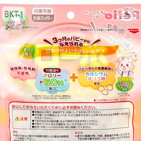 | 特長 | ●口溶けのやさしいボーロです。 ●パピーからの健康維持にカルシウム、オリゴ糖を配合しました。 ●からだにうれしいカロリー約50%オフ(「体にうれしいボーロちゃん野菜Mix」比)です。 ●北海道産ばれいしょでんぷんを使用しました。 ●保存料、着色料不使用です。 |