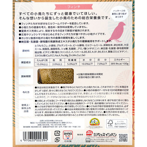 | 特長 | ●小鳥たちの健康を考え、着色料・保存料は使用していません。 ●文鳥やジュウシマツをはじめとするフィンチたちが食べやすい小粒タイプです。 ●納豆菌・乳酸菌・酵母菌の発酵熟成エキスが小鳥たちの健康維持をサポートします。 |