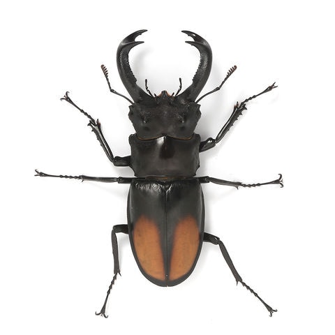 | どんな種類? | 上翅のオレンジが美しいフタマタクワガタです。赤褐色に色づく上翅と漆黒の頭部の色彩が美しく、大きく湾曲した太い大アゴが特徴的です。フタマタクワガタの名の通り先端が2つに分かれた大アゴを持ち、流通量が多いことからフタマタクワガタの入門種とされています。活発で非常に攻撃的な性格を見せ、クワガタの中でも屈指のファイターと言えます。産地によって上翅の赤い部分の面積が異なり、ボルネオ島産のものは赤い部分が多いこと、流通量が少ないことから珍重されています。 フタマタクワガタの仲間はノコギリクワガタに近い種で、他のクワガタに比べ種類数の少ないグループです。学名の“Hexarthrius”は、触角が6節しかない本グループの特徴を示しています。他にも先端が二又になった大アゴや、大きく発達した頭盾、荒い気性が特徴です。 |
