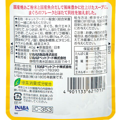 _neko いなば 旨味スープパウチ まぐろ ほたて貝柱入り 40g 4901133621017 IC-353 キャットフード ウェットフード CIAO こだわり 旨味スープ こだわり旨味スープ 国産 日本製 一般食 猫 ねこ 猫用 ねこ用 成猫 成猫用 ほたて 鮪 帆立 opa2_choku 2袋入り 20211126 y21m11 mikari ×2袋 y21m10 wp2407inaba