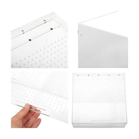 | 特長 | ●爬虫類や昆虫の飼育・展示に適したのアクリル製飼育ケースです。 ●透明度が高いアクリルを使用しています。 ●フタはスライド式で、マグネットストッパーでピタッと閉じることができます。 ●空気穴も2mmと小さく、小型昆虫でも逃げにくい設計になっています。 ●底面は白色となっているため、ケージ全体が明るく見えます。 |