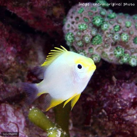 | 種類詳細 | やや深場に生息する、他種に比べると体高がある中型のスズメダイです。 体色は白ベースに頭部及び各ヒレが黄色をしており、繁殖期のオスは青みがかった色に変化します。 |