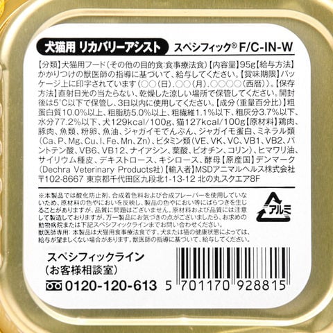 メーカー画像 スペシフィック 犬猫用 リカバリーアシスト F/C-IN-W 95g 5701170928815 20220117 y22m01 wakaoo 猫 ネコ cat neko シニア猫 尿 療養食 猫フード キャットフード プレミアムフード 鶏肉 豚肉 ヘルスフード 食事療法食 SPECIFIC 術後 高栄養フード スペシフィックライン