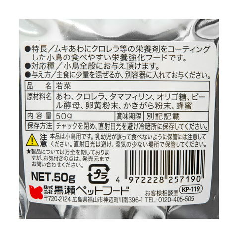 _animal 黒瀬ペットフード 若菜 50g 4972228257190 小動物 鳥 フード 餌 エサ おやつ 小鳥全般 小型インコ 中型インコ セキセイインコ オカメインコ フィンチ カナリア ブンチョウ 文鳥 粟 アワ クロレラ 卵黄 カルシウム カキガラ ボレー ボレー粉 カキ殻 牡蠣殻 Chlorella 50g×2袋 20220104 kak y22m01