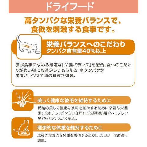 | 特徴 | 【ドライフード】 ●猫が食事に求める最適な「栄養バランス」を配合。食へのこだわりが強い猫にも満足してもらえる、高タンパクな栄養バランスで猫の食欲を刺激します。 【ウェットフード】 ●食べない悩みを持つこだわり愛猫に、感覚からアプローチをするウェットフードです。 |