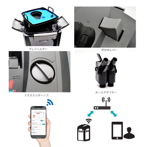 | ご注意 | ※本品は観賞魚用のフィルターです。他の目的では使用しないでください。 ※フィルター内部の汚れ表示、メールのお知らせ機能はあくまでも「目安」の表示となっています。 ※Wi-Fi機能のご使用には、フィルター本体のほかに操作する端末(ケイタイ、PC、) |